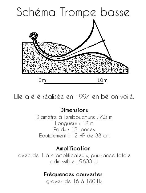 Comme nous l’avons dit, les trompes devaient agir comme un phonographe, en amplifiant le son acoustiquement, par le biais d’une forme parabolique. Michel Stievenart dut pour cela réaliser plusieurs calculs de manière à ce que les pavillons répondent à deux qualités principales : Le rendement énergétique et la directivité. Il fallut, pour le rendement trouver l’orientation et le surplomb les plus adaptés à la réverbération du son face aux aspérités de la falaise. Pour la directivité, ils dut faire en sorte que l’on perde le moins d’énergie possible, c’est-à-dire éviter une trop grande dispersion du son et trouver un angle pour que les espaces entre les échos soient audibles et non superposés.