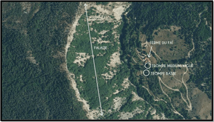La falaise de la Plane et ses aspérités ( cerclées en rouge sur la photographie ci-dessous) font partie intégrante de l’instrument, il s’agit même son principal atout. En effet, sans la falaise, les trompes ne fonctionneraient pas car c’est contre elle que va se réverbérer le son. Située à 400m de distance des trompes, le temps de retour du son « projeté » va être de 2,3 secondes. C’est précisément ce phénomène que l’on va appeler « écho ». Dans le documentaire audio présenté plus haut, Pierre Jacques, un des pères fondateurs, nous explique que plus le rythme de la musique diffusée va être lent, les notes seront bien détachées et la partition simple, plus l’effet sera profond et jouera avec nos émotions. Pour utiliser les trompes, il est donc conseillé de s’essayer aux bruitages vocaux, à la musique classique ou expérimentale, mais le sound-design, le lyrisme et les musiques de films ont aussi fait leurs preuves. Toutefois, les trompes restent des instruments imprévisibles, sans règles, dont la qualité sonore varie également avec le temps et la température qu’il fait et leur conservation n’en demeure évidemment pas moins compliquée. Un entretien régulier est indispensable à sa « survie ».